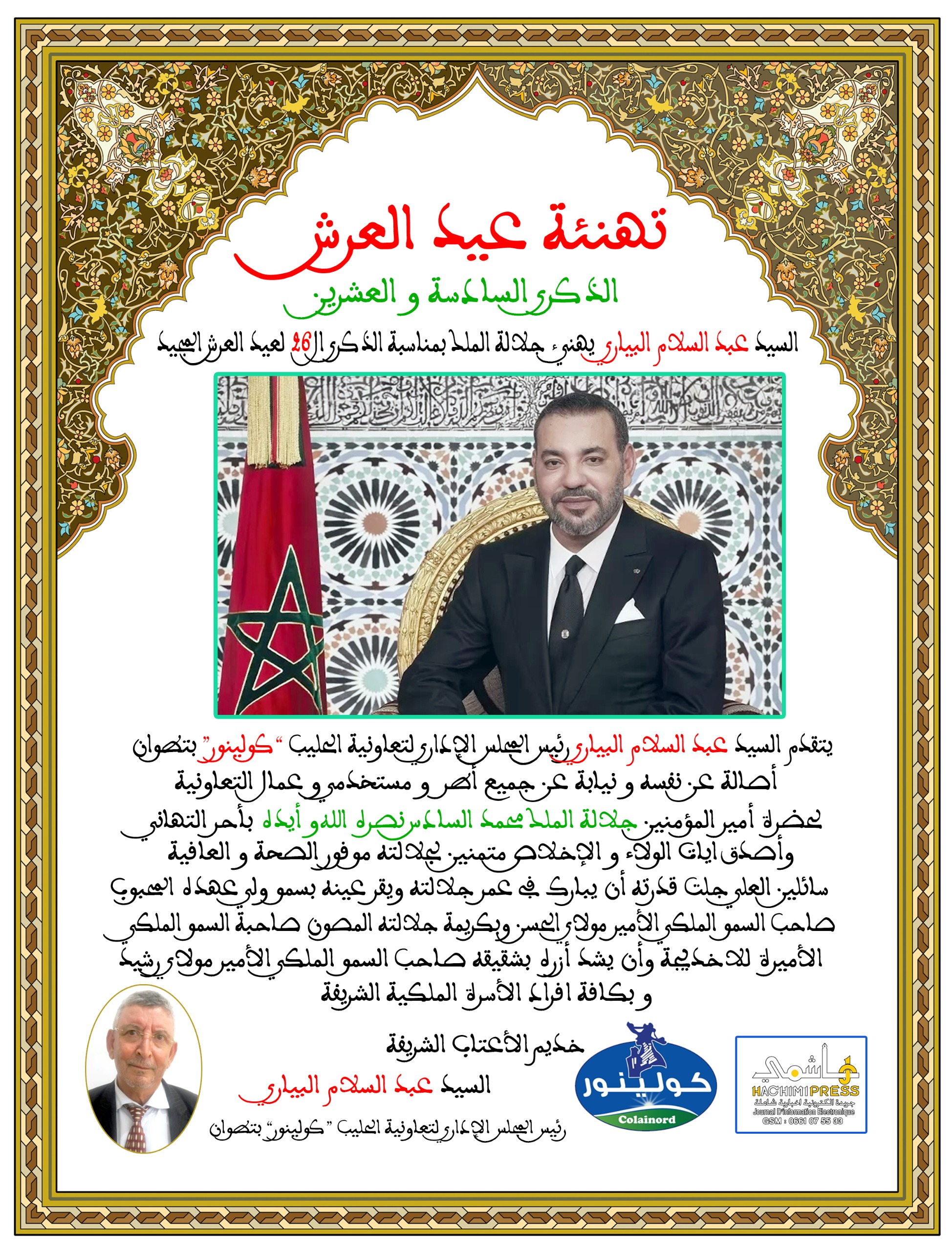 السيد عبد السلام البياري رئيس المجلس الإداري لتعاونية الحليب كولينور بتطوان يهنئ صاحب الجلالة بالذكرى ال 26 لعيد العرش المجيد