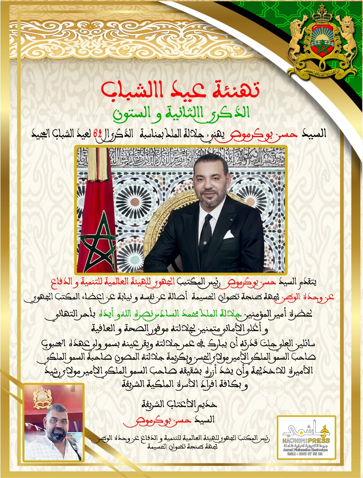 السيد حسن بوكرموص رئيس المكتب الجهوي للهيئة العالمية للتنمية و الدفاع عن وحدة الوطن يهنئ جلالة الملك بالذكرى ال 62 لعيد الشباب المجيد
