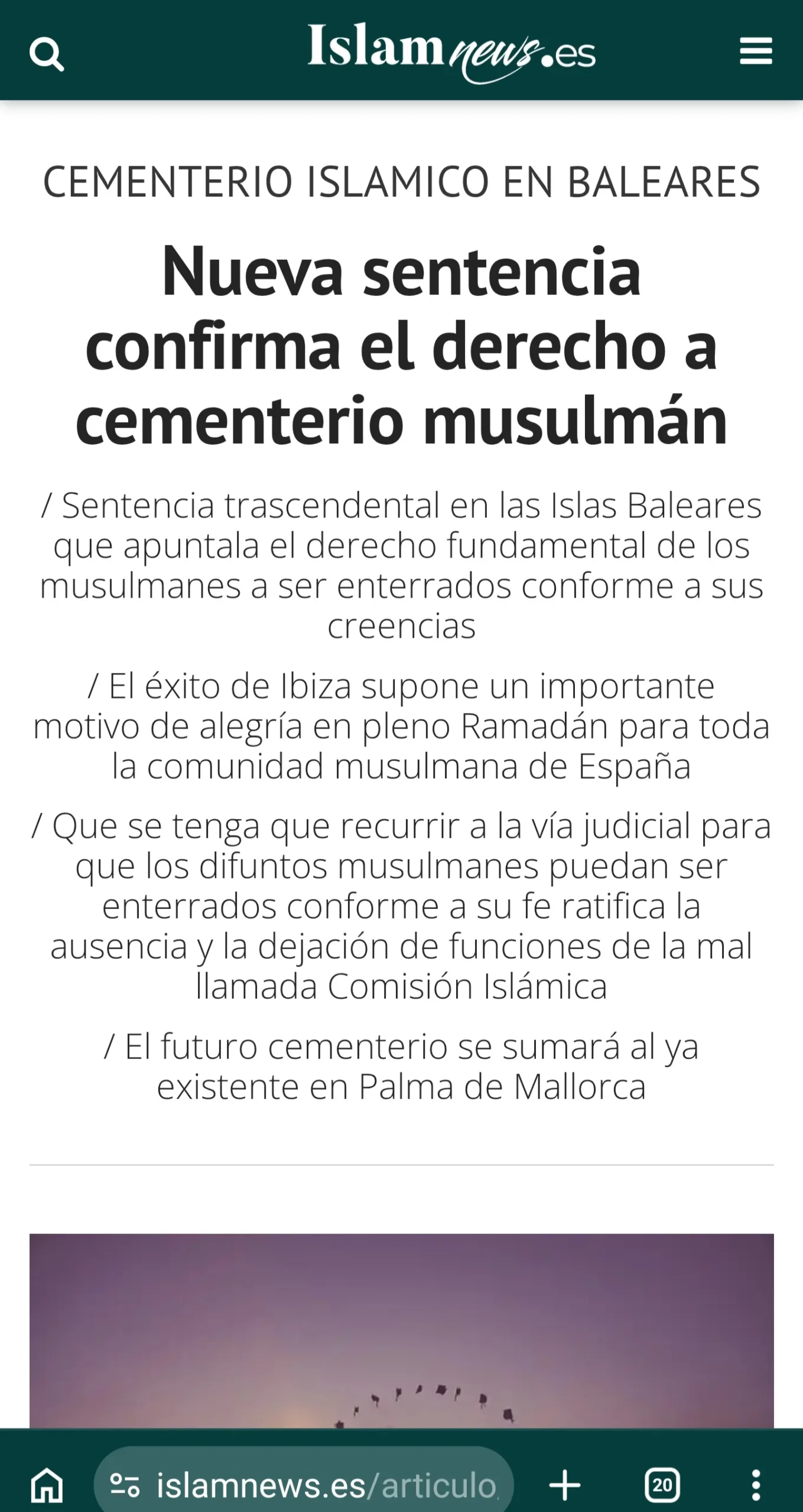 أفادت الجريدة الإلكترونية إسلام نيوز في عددها الصادر يوم 19 فبراير 2026، أن هيئة قضائية في جزر البليار أصدرت حكمًا جديدًا يعزز الحق الأساسي للمسلمين في الدفن وفقًا لمعتقداتهم الدينية، في خطوة وُصفت بالتاريخية داخل الأوساط الحقوقية والدينية بإسبانيا.
