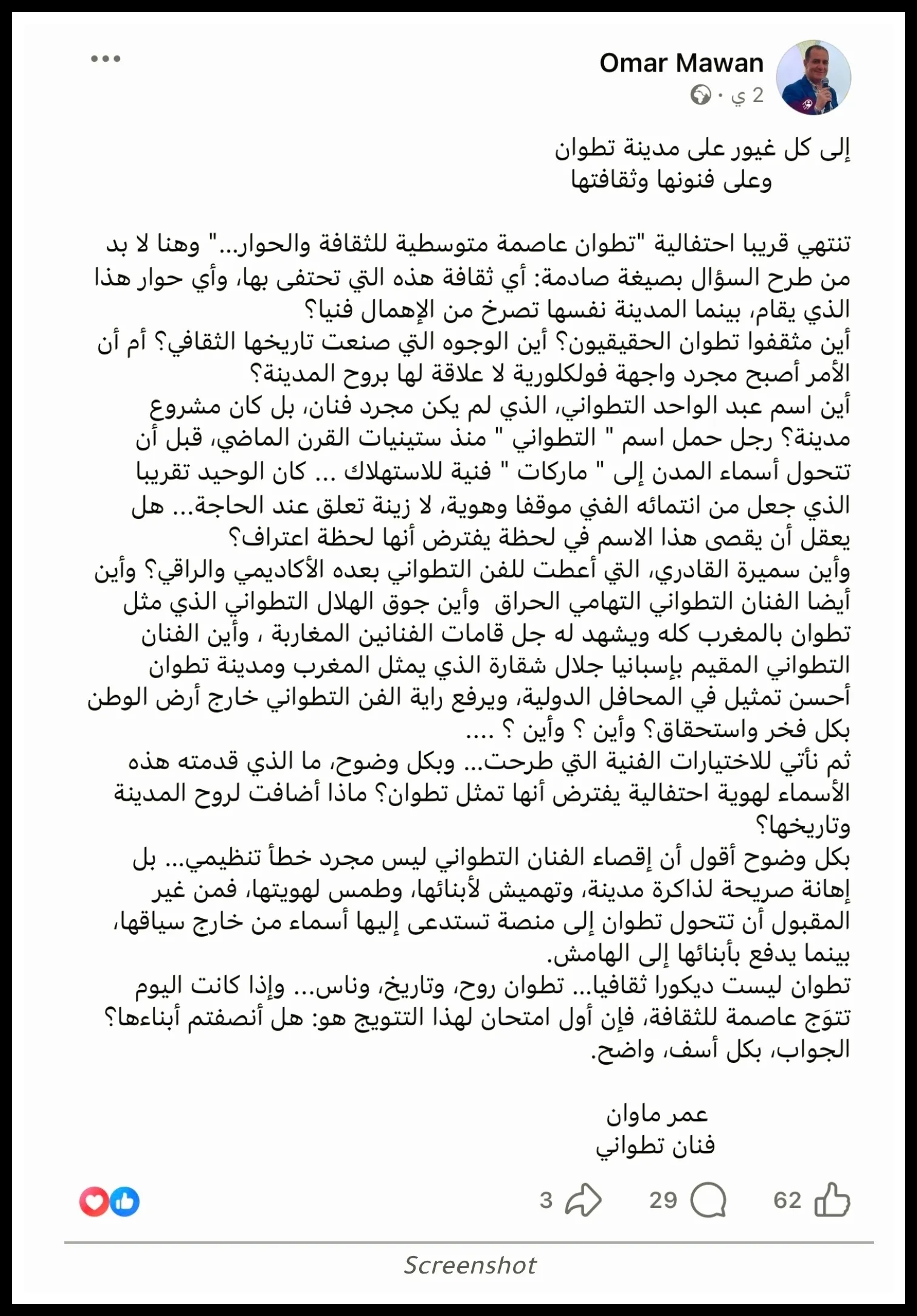 وبينما خيّم الحزن على أجواء المدينة، سرعان ما تحوّلت منصات التواصل الاجتماعي، خاصة “فيسبوك”، إلى فضاء للنقاش الحاد، حيث عبّر فاعلون ومهتمون بالشأن الثقافي المحلي عن استيائهم مما وصفوه بـ“إقصاء غير مبرر” لرموز فنية بارزة من البرنامج الرسمي للاحتفالية، معتبرين أن الأمر يطرح علامات استفهام حول مدى تمثيلية هذه التظاهرة لهوية المدينة الثقافية.