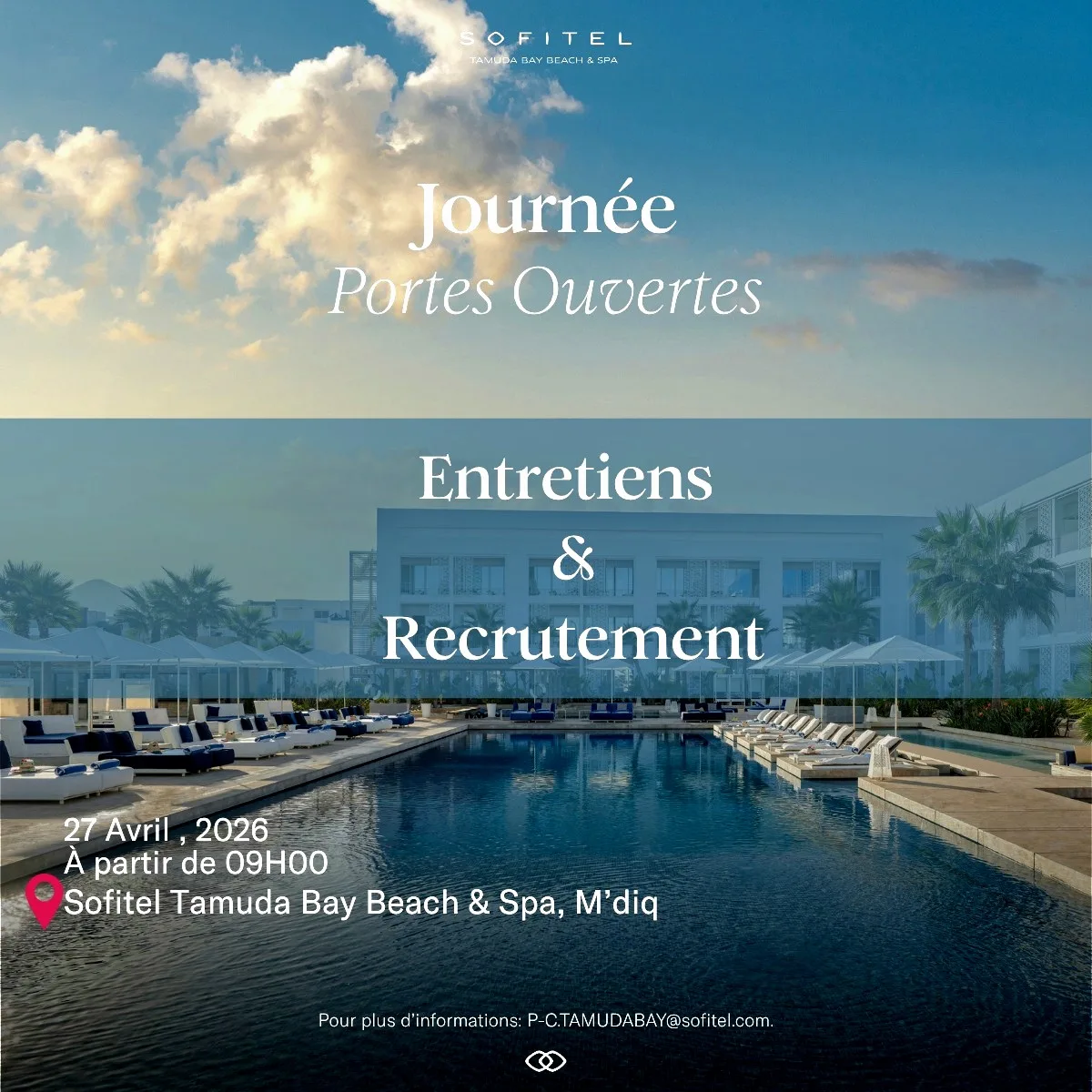وفي هذا الصدد، تدعو إدارة الفندق جميع المترشحين المهتمين إلى الحضور بكثافة في الموعد المحدد والمشاركة الفعالة في هذه المقابلات المباشرة. ولضمان تواصل فعال أو للحصول على المزيد من المعلومات الدقيقة حول التخصصات المطلوبة، وضعت الإدارة رهن إشارة العموم البريد الإلكتروني التالي: