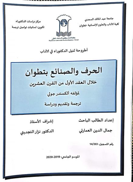 في جو علمي وأكاديمي مفعم بالجدية والاجتهاد، تتم اليوم الأربعاد 28 يوليوز 2021 مناقشة أطروحة جامعية، بمركز الدكتوراه في الآداب والعلوم الإنسانية والترجمة، بكلية آداب تطوان، تقدم بها الطالب الباحث جمال الدين العمارتي، تكوين لسانيات تواصل ترجمة في موضوع: الحرف والصنائع بتطوان خلال العقد الأول من القرن العشرين، لمؤلفه ألكسندر جولي، ترجمة وتقديم ودراسة. تحت إشراف الدكتور نزار التجديتي وأمام لجنة مكونة من الاساتذة مصطفى الغاشي رئيسا نزار التجديتي مشرفا ومحمد الحاتمي ووفاء بوعصاب عضوين.