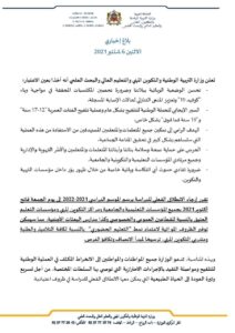 في إعلان جديد بمثابة قرار رسمي لوزارة التربية الوطنية والتكوين المهني والتعليم العالي والبحث العلمي تقرر تأجيل انطلاق الموسم الدراسي برسم الموسم الدراسي 2021-2022 إلى يوم الجمعة فاتح أكتوبر 2021، ويهم ذلك كل المؤسسات التعليمية والجامعية وكذا مراكز التكوين المهني ومؤسسات التعليم العتيق، بالنسبة للقطاعين العمومي والخصوصي وشمل التأجيل أيضا مدارس البعثات الأجنبية.