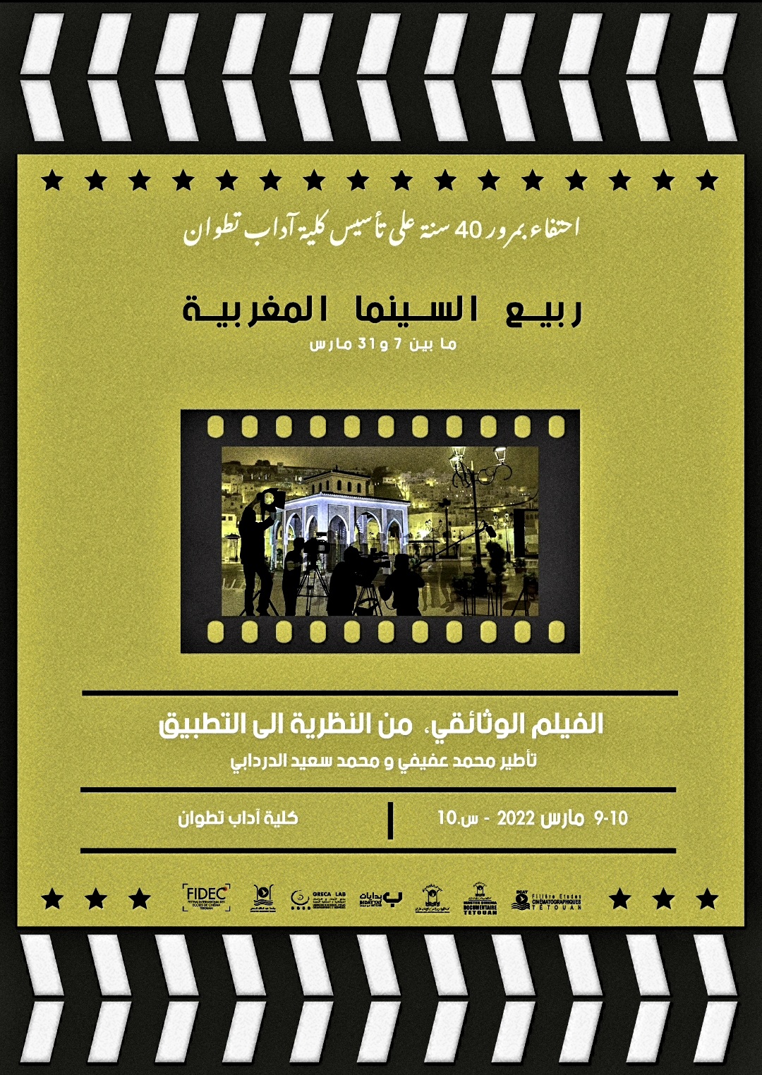 في إطار فعاليات أيام ربيع السينما المغربية المنظمة من طرف مختبر الدراسات السينمائية والسمعية البصرية بشراكة مع التكوينات السينمائية بكلية آداب تطوان ومهرجان تطوان الدولي لمدارس السينما وجمعية بدايات احتفاء بمرور 40 سنة على تأسيس كلية آداب تطوان ، سيتم برمجة تكوينات سينمائية وفنية، من بينها ورشة تكوينية أيام 9 و 10 مارس بعنوان “إخراج فيلم وثائقي من النظرية إلى التطبيق” من تأطير الباحث والمخرج السينمائي محمد سعيد الدردابي و الباحث و مهندس الصوت محمد عفيفي تحت اشراف الاستاذ حميد العيدوني. و تنظم هذه الورشة بشراكة مع شعبة الدراسات الاسبانية