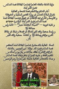 على إثر البلاغ الصادر عن وزارة القصور الملكية و التشريفات و الأوسمة و الذي تم فيه الإعلان عن تعرض صاحب الجلالة الملك محمد السادس نصره الله و أيده لنزلة برد grippe, و عليه تتوجه السيدة المفضلة أخيار نائبة رئيس جماعة أزلا ورئيسة جمعية رباط الخير أصالة عن نفسها و نيابة عن كافة أطر و موظفي جماعة أزلا وأعضاء جمعية رباط الخير إلى السدة العالية بالله حضرة صاحب الجلالة الملك المعظم محمد السادس نصره الله مولانا أمير المؤمنين بالدعاء إلى العلي القدير أن يحفظ جلالته من كل سوء ونسأله من عظيم لطفه و كرمه الجميل أن يشفي ملكنا محمد السادس و يمده بالصحة و العافية عاجلا غير اجلا .