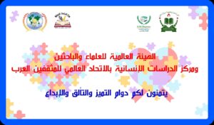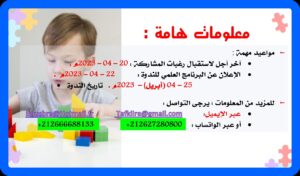 يسر الهيئة العالمية للعلماء والباحثين ومركز الدراسات الإنسانية بالاتحاد العالمي المثقفين أن تدعو السادة العلماء والباحثين إلى المساهمة بأوراق بحثية ضمن ندوة دولية بعنوان “التوحد مرض العصر: تعريفه وسبل الوقاية منه”. المزمع انعقاده يوم 25/04/2023 بمدينة تطوان. آخر آجل لاستقبال المشاركات هو 20/04/2023.