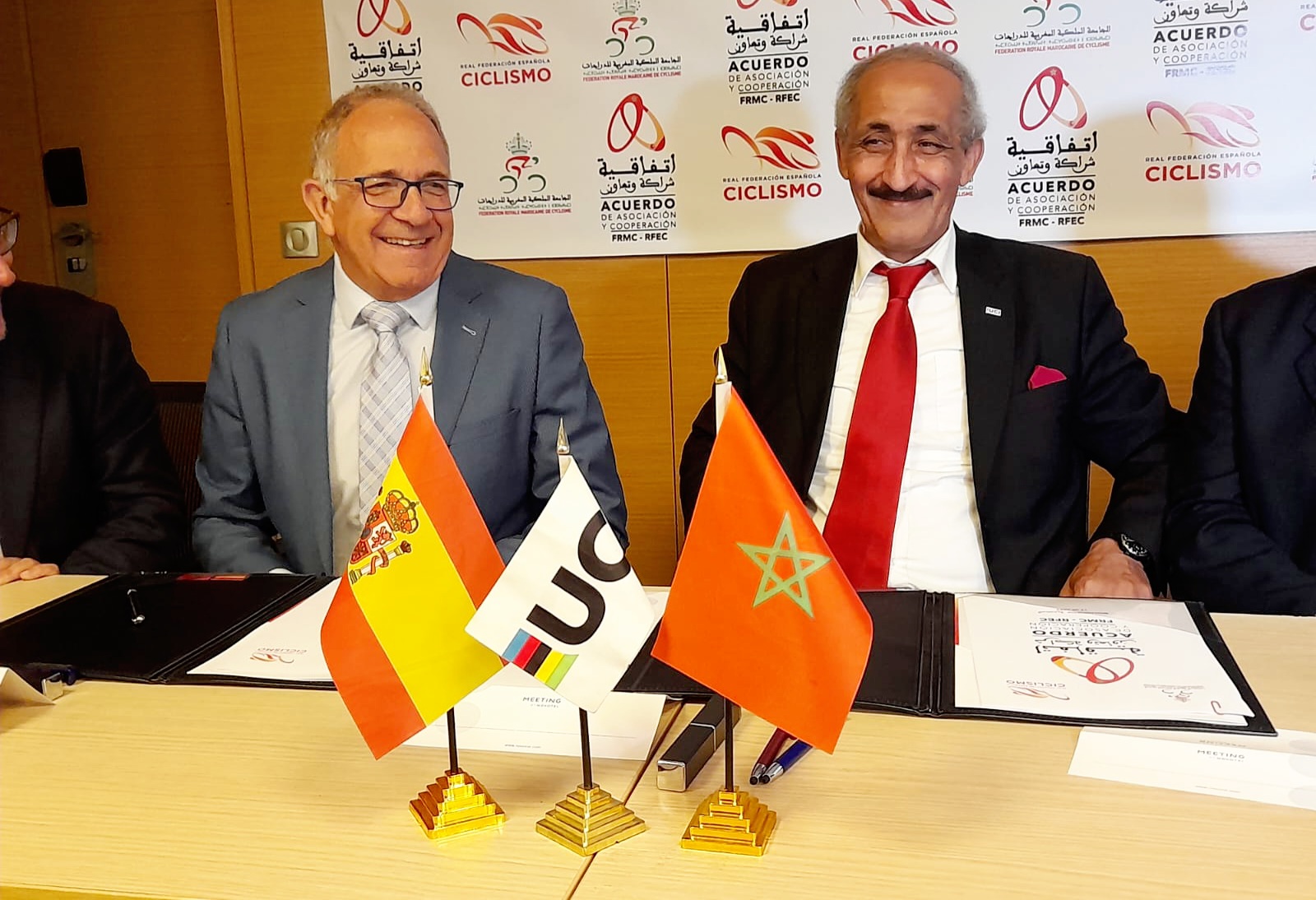 ووقع هذه الاتفاقية عن الجانب المغربي، رئيس الجامعة الملكية المغربية للدراجات ،محمد بلماحي، ونائبه ،محمد كاتم، والكاتب العام للجامعة لحسن خرسي، وعن الجانب الإسباني كل من رئيس الجامعة الملكية الإسبانية للدرجات خوسي لويس لوبيز اليخاندرو وكاتبها العام ، مارتين غارسيا.