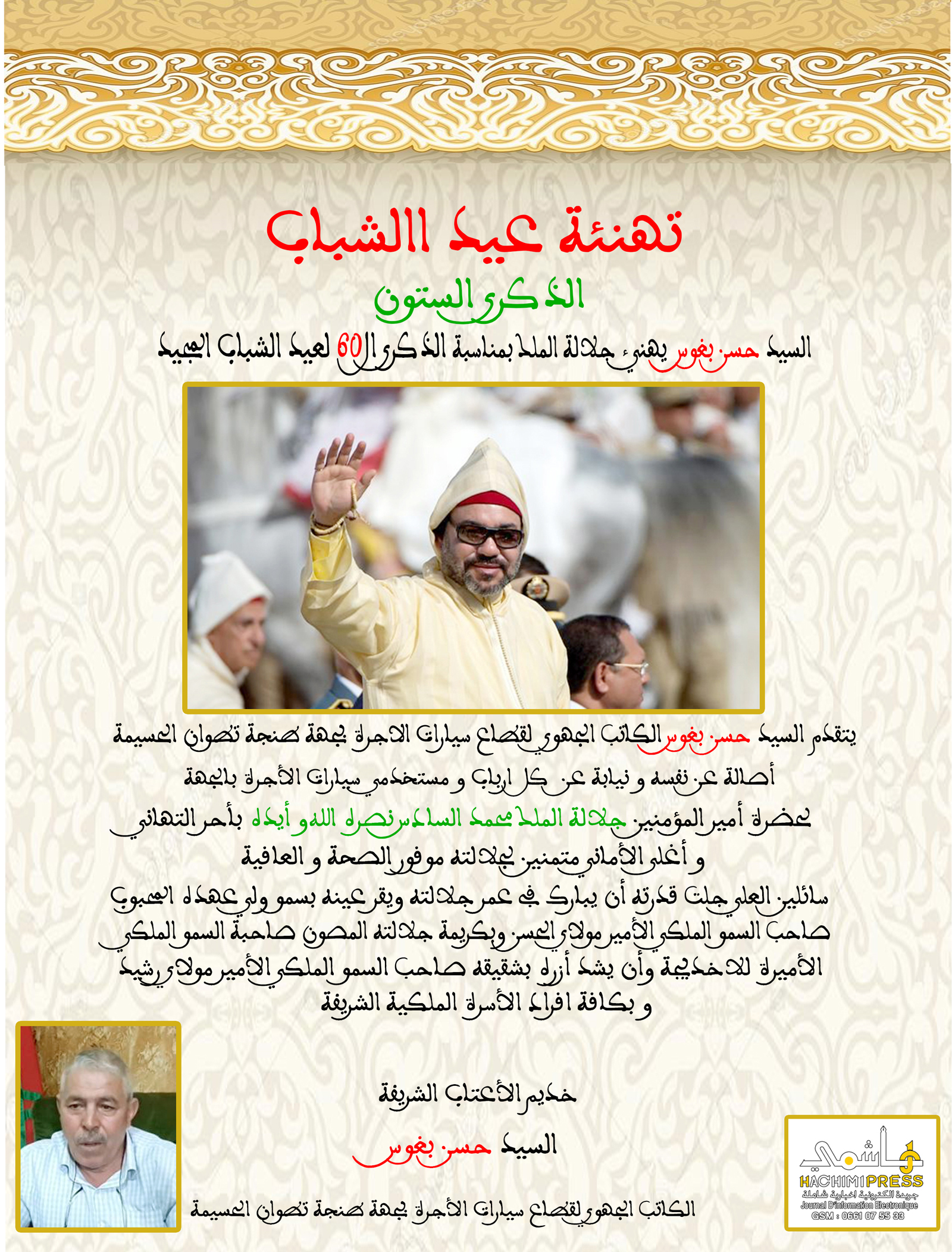 السيد حسن بغوس يهنئ جلالة الملك بمناسبة الذكرى الـــ 60 لعيد الشباب المجيد في أغسطس 23- 2023 0 762 انشر 0 762 انشر