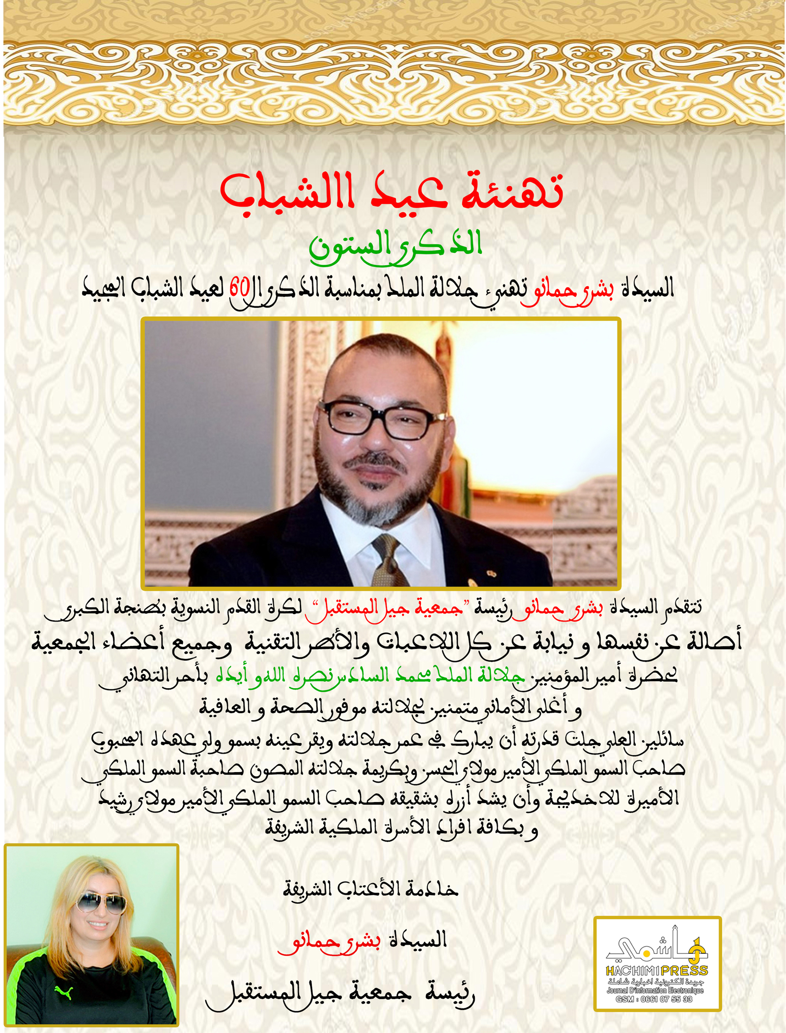 السيدة بشرى حمانو تهنئ جلالة الملك بمناسبة الذكرى الـــ 60 لعيد الشباب المجيد في أغسطس 23- 2023 0 649 انشر 0 649 انشر