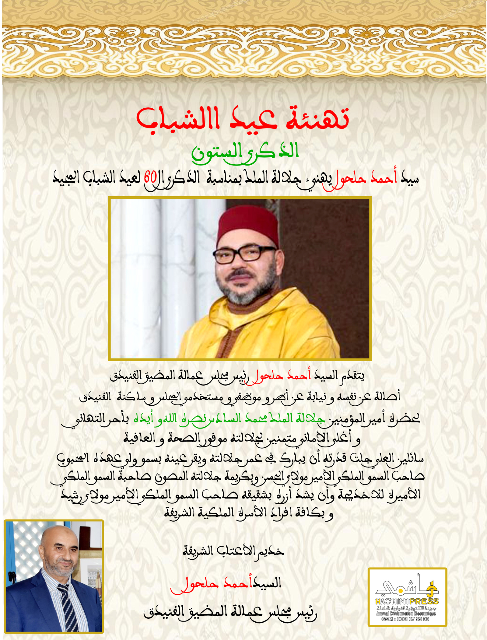 السيد احمد حلحول يهنئ جلالة الملك بمناسبة الذكرى الـــ 60 لعيد الشباب المجيد في أغسطس 23- 2023 0 760 انشر 0 760 انشر