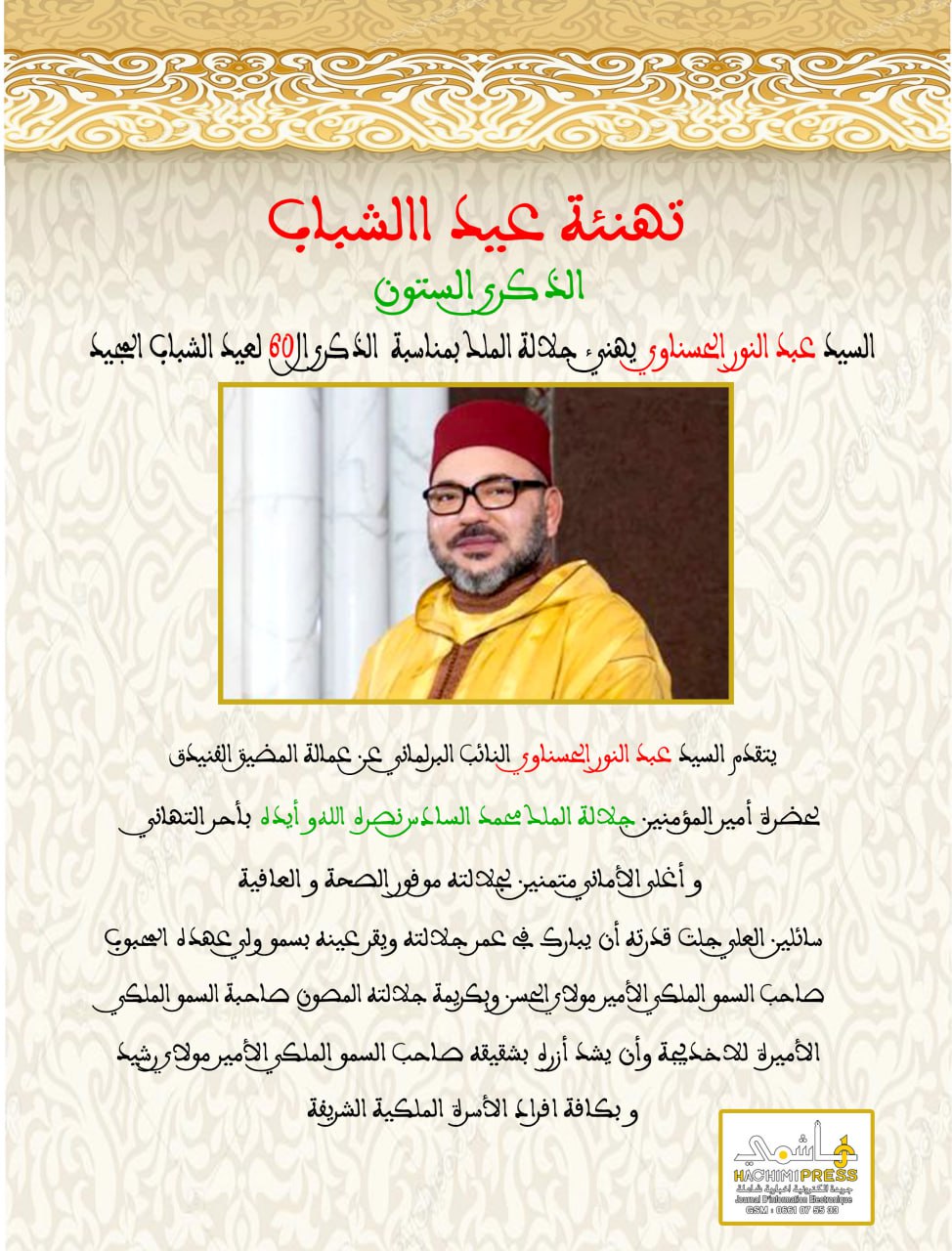 السيد عبدالنور الحسناوي يهنئ جلالة الملك بمناسبة الذكرى الـــ 60 لعيد الشباب المجيد آخر تحديث أغسطس 25- 2023 0 757 انشر 0 757 انشر
