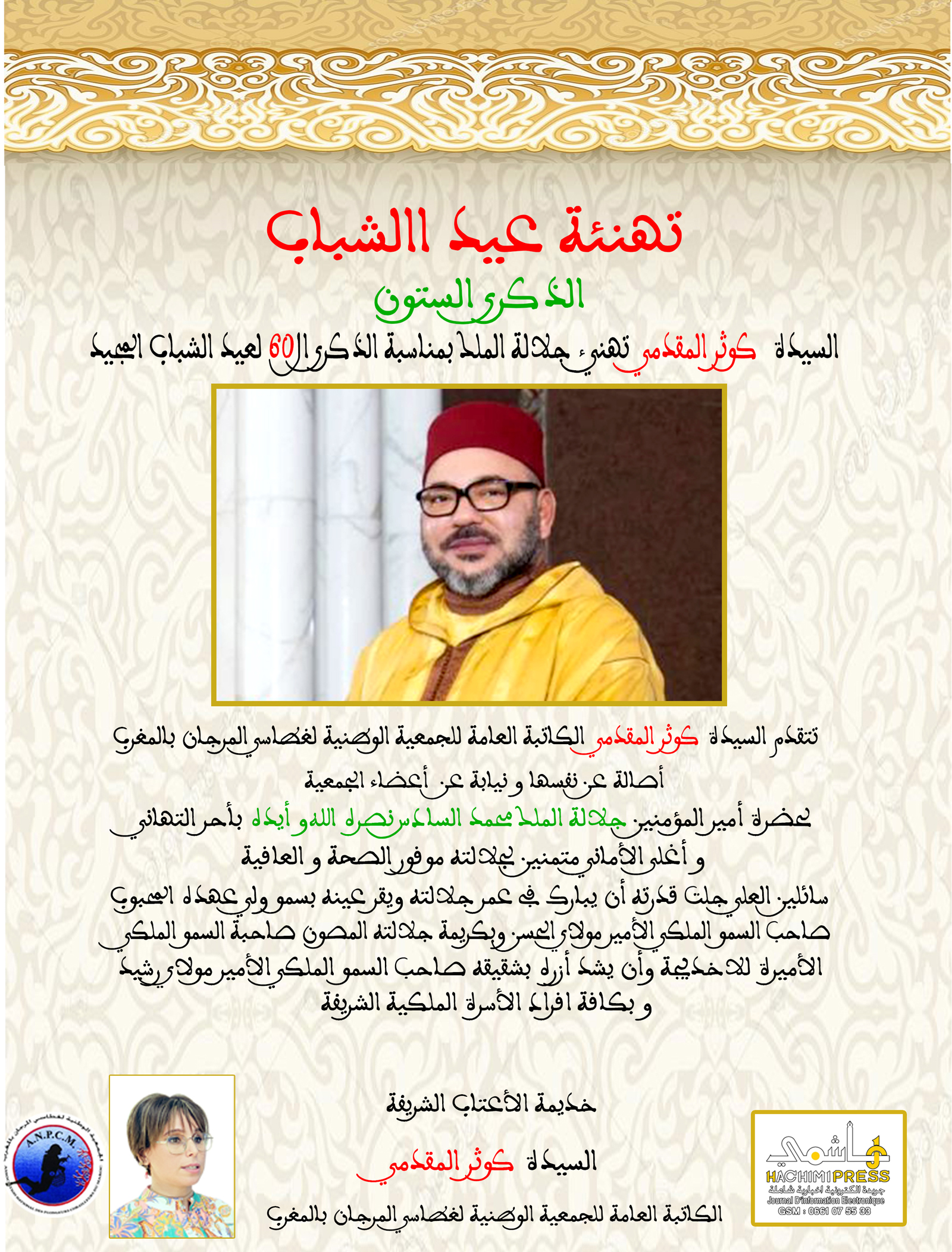 السيدة كوثر المقدمي تهنئ جلالة الملك بمناسبة الذكرى الـــ 60 لعيد الشباب المجيد في أغسطس 23- 2023 0 1٬600 انشر 0 1٬600 انشر