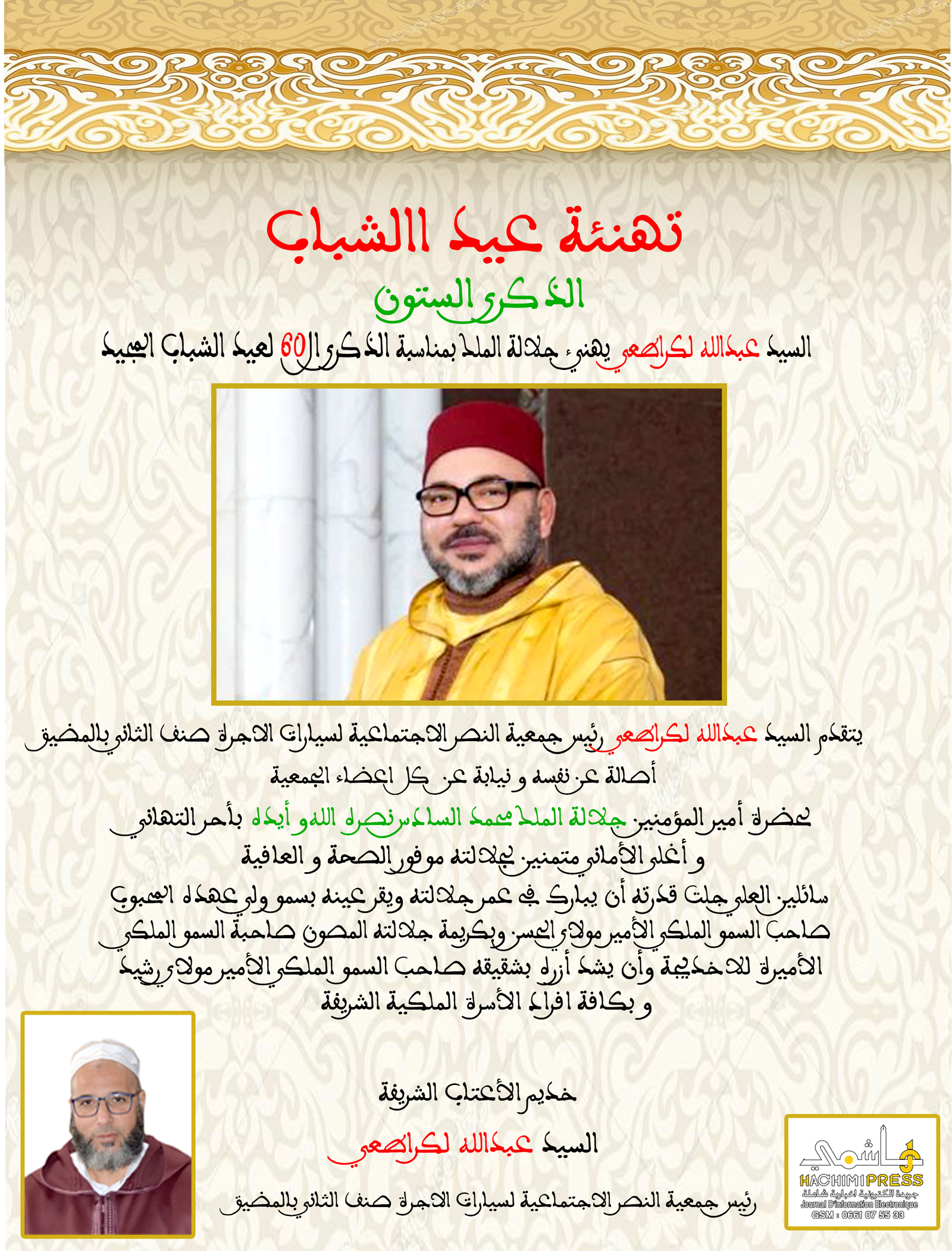 السيد عبدالله لكراطعي يهنئ جلالة الملك بمناسبة الذكرى الـــ 60 لعيد الشباب المجيد في أغسطس 23- 2023 0 1٬030 انشر 0 1٬030 انشر