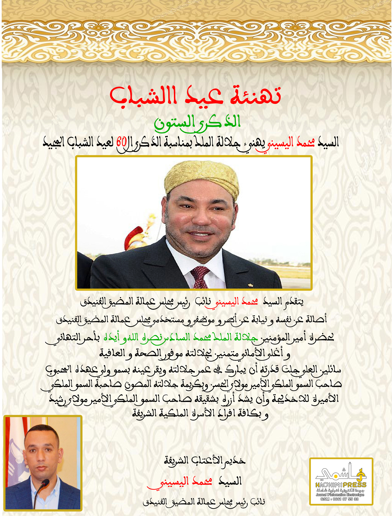السيد محمد اليسيني يهنئ جلالة الملك بمناسبة الذكرى الـــ 60 لعيد الشباب المجيد آخر تحديث أغسطس 23- 2023 0 1٬889 انشر 0 1٬889 انشر