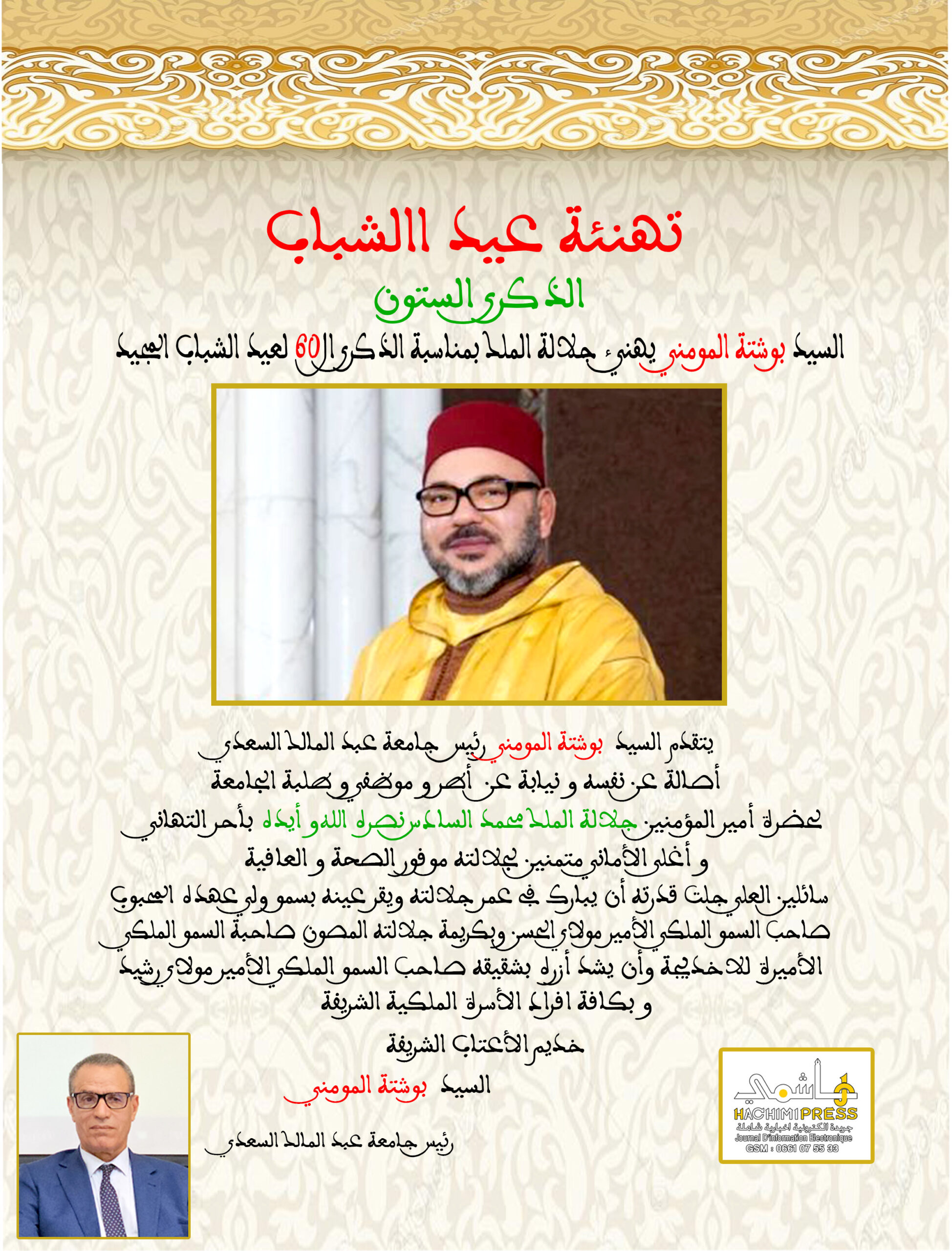 السيد بوشتة المومني يهنئ جلالة الملك بمناسبة الذكرى الـــ 60 لعيد الشباب المجيد في أغسطس 23- 2023 0 1٬646 انشر 0 1٬646 انشر