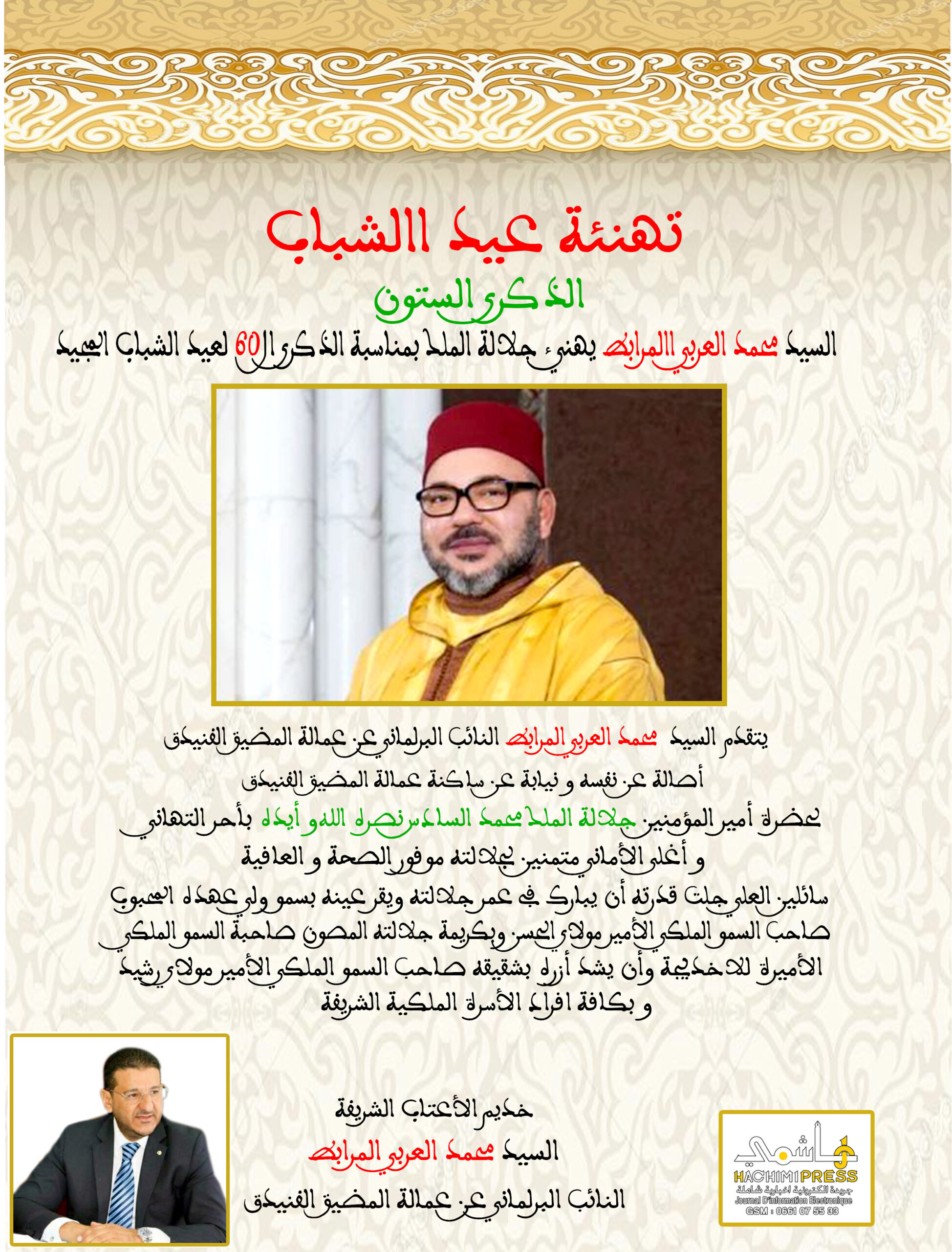 السيد محمد العربي المرابط يهنئ جلالة الملك بمناسبة الذكرى الـــ 60 لعيد الشباب المجيد في أغسطس 24- 2023 0 1٬938 انشر 0 1٬938 انشر