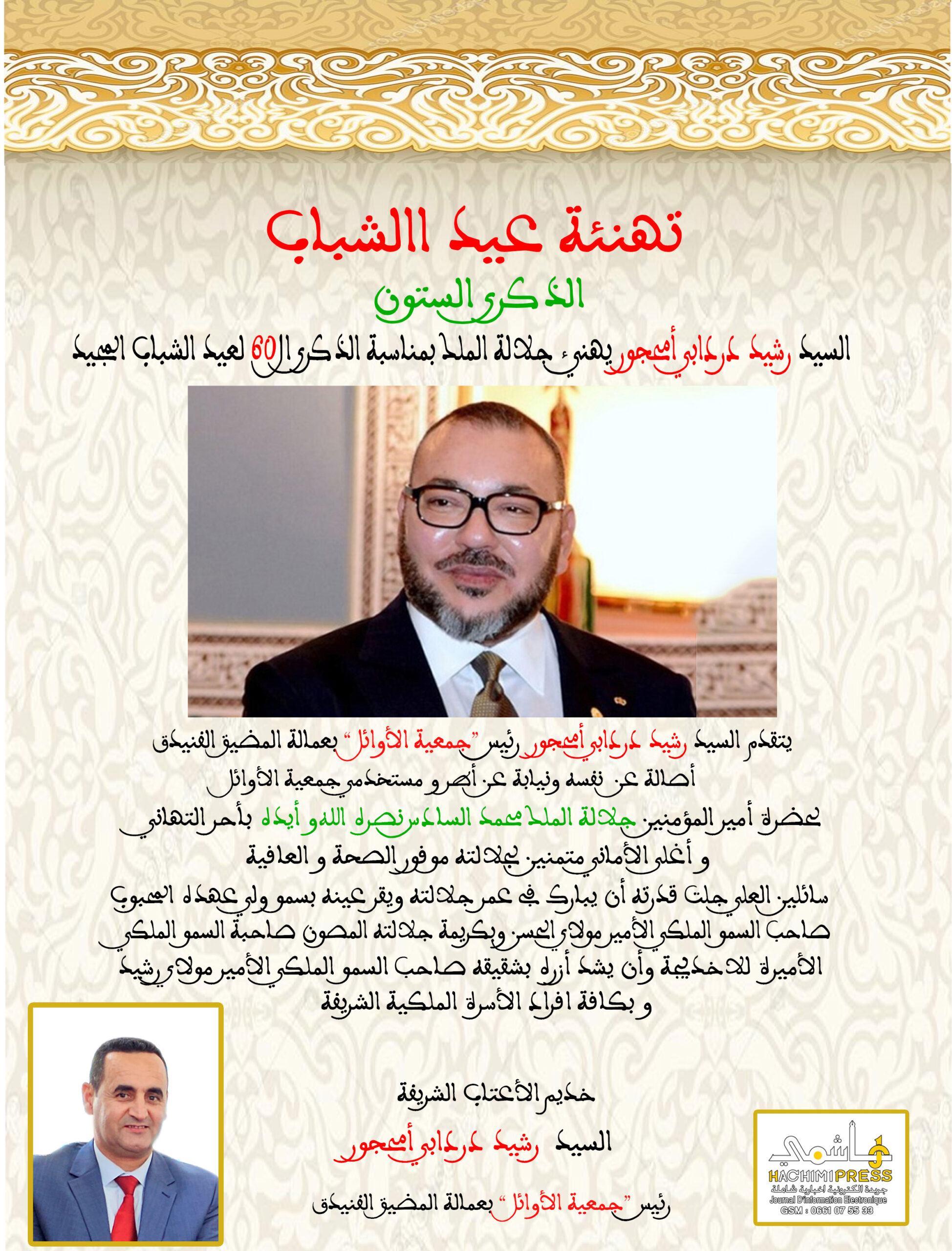 السيد رشيد دردابي أمحجور يهنئ جلالة الملك بمناسبة الذكرى الـــ 60 لعيد الشباب المجيد في أغسطس 24- 2023 0 1٬605 انشر 0 1٬605 انشر