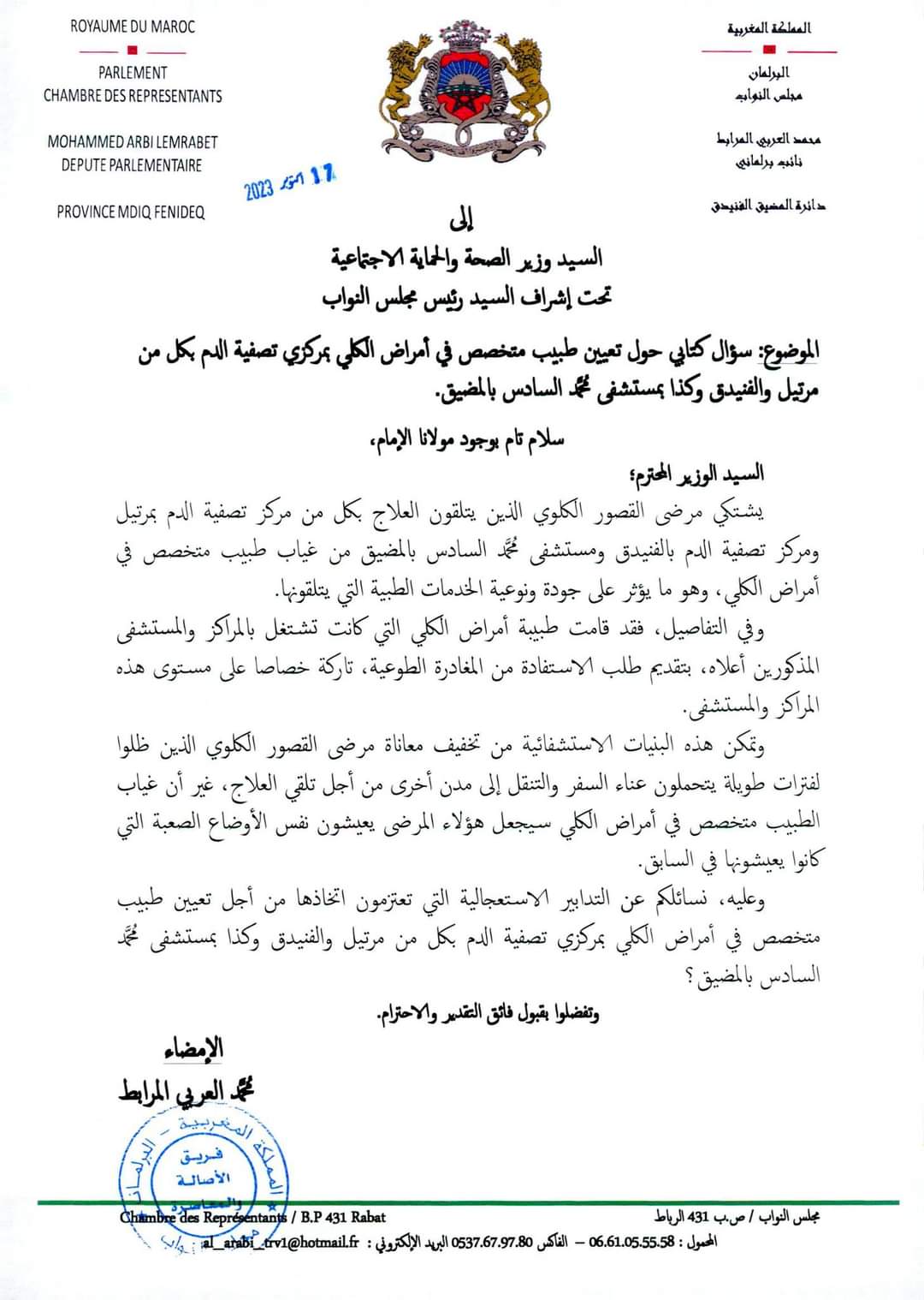 سؤال كتابي من النائب البرلماني عن دائرة المضيق الفنيدق السيد محمد العربي المرابط، للسيد وزير الصحة والحماية الإجتماعية السيد خالد آيت الطالب حول تعيين طبيب في أمراض الكلي بمركزي تصفية الدم بكل من مرتيل والفنيدق وكذا بمستشفى محمد السادس بالمضيق.