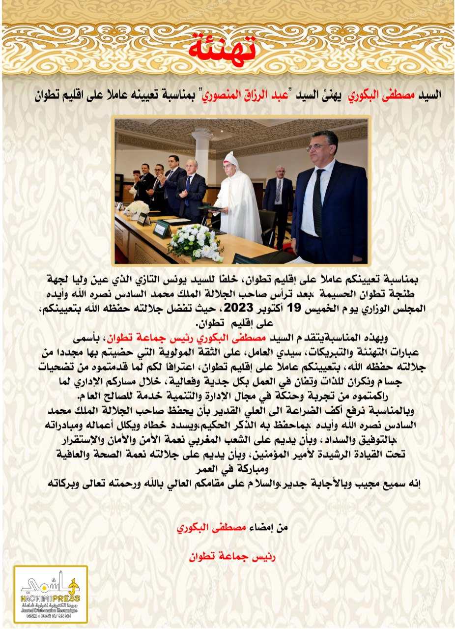 السيد مصطفى البكوري رئيس جماعة تطوان يهنئ السيد عبد الرزاق المنصوري بمناسبة تعيينه عاملا على إقليم تطوان