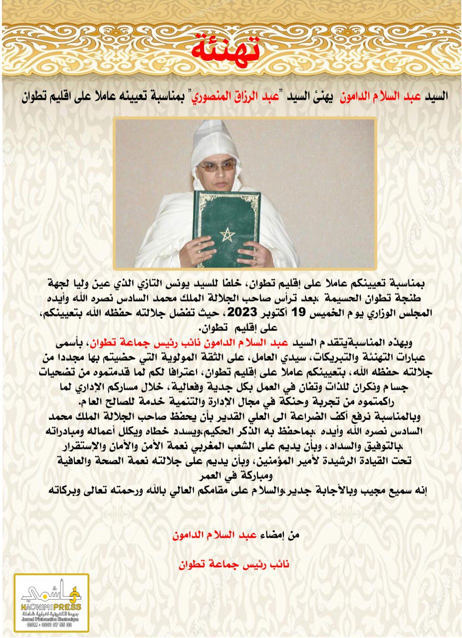 السيد عبد السلام الدامون نائب رئيس جماعة تطوان يهنئ السيد عبد الرزاق المنصوري بمناسبة تعيينه عاملا على إقليم تطوان