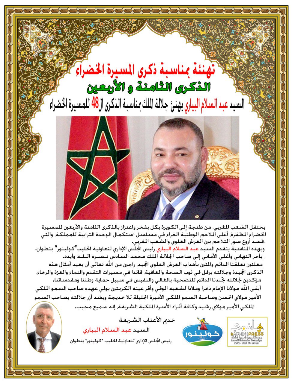 السيد عبد السلام البياري رئيس المجلس الإداري لتعاونية الحليب “كولينور” بتطوان يهنئ جلالة الملك بمناسبة الذكرى ال48 للمسيرة الخضراء المظفر