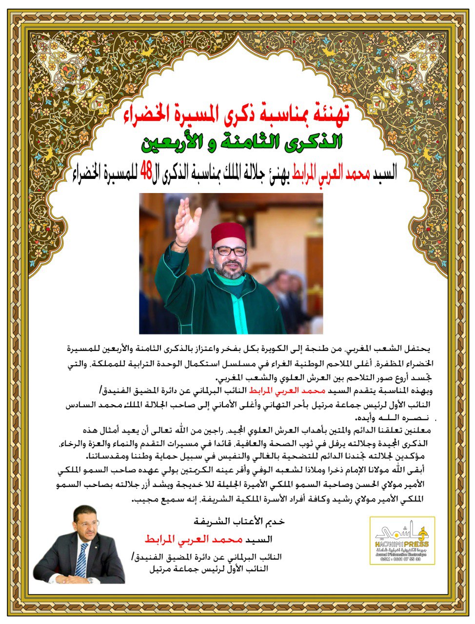 السيد محمد العربي المرابط النائب البرلماني عن دائرة المضيق الفنيدق/الناب الأول لرئيس جماعة مرتيل يهنئ جلالة الملك بمناسبة الذكرى ال48 للمسيرة الخضراء المظفرة