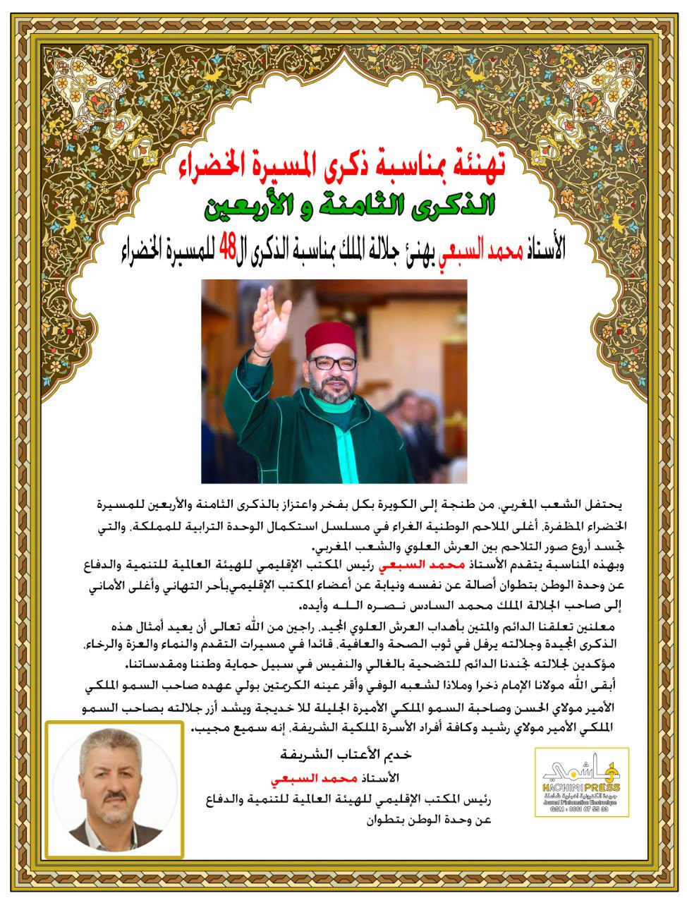 الأستاذ محمد السبعي رئيس المكتب الإقليمي للهيئة العالمية للتنمية والدفاع عن وحدة الوطن بتطوان يهنئ جلالة الملك بمناسبة الذكرى ال48 للمسيرة الخضراء المظفرة