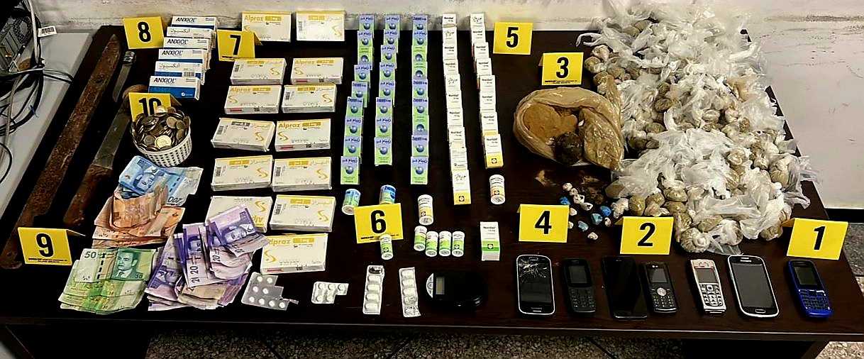 وقد جرى توقيف المشتبه فيهما بمرآب بإحدى المناطق ضواحي مدينة تطوان، حيث أسفرت عملية التفتيش عن العثور بحوزتهما على 1993 قرص طبي مخدر وكيلوغرام من مخدر الشيرا، فضلا عن حجز أسلحة بيضاء وميزان إلكتروني وهواتف نقالة بحوزة الموقوفين ومبلغ مالي يشتبه في كونه من عائدات هذا النشاط الإجرامي.
