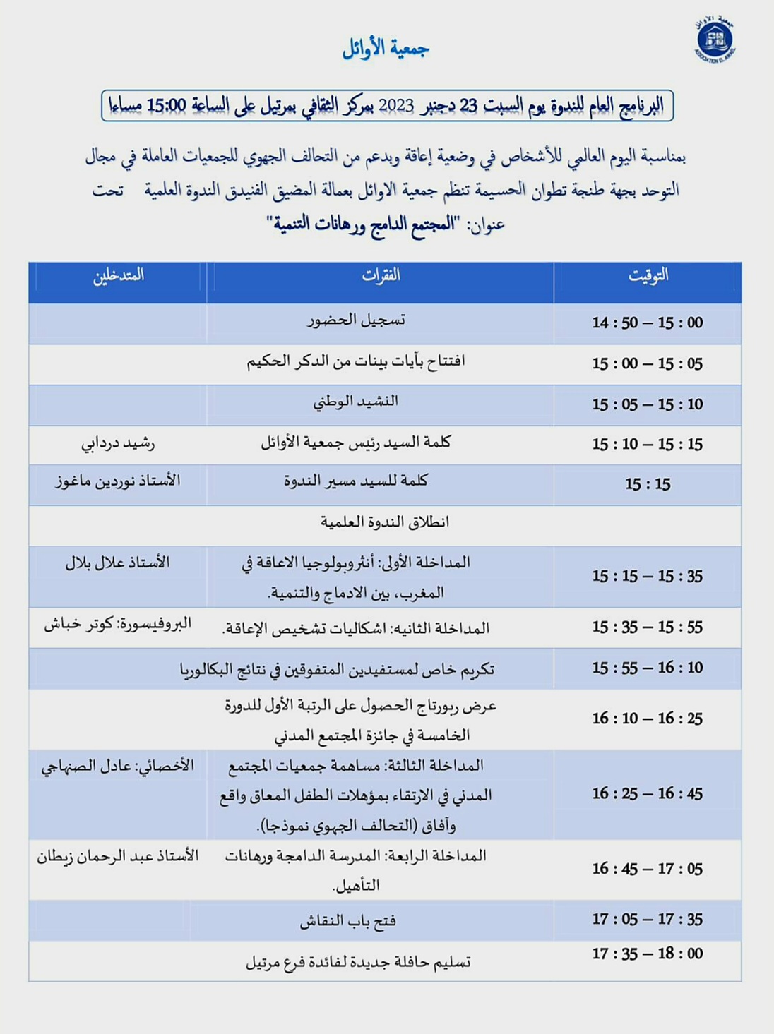 بمناسبةاليوم العالمي للأشخاص في وضعية إعاقة وبدعم من التحالف الجهوي للجمعيات العاملة في مجال التوحد بجهة طنجة تطوان الحسيمة, تنظم جمعية الأوائل ندوة علمية تحت عنوان” المجتمع الدامج ورهانات التنمية”.