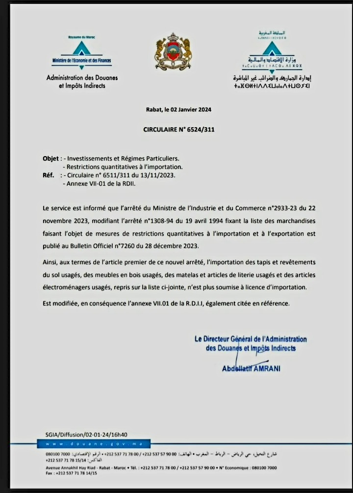 تراجعت وزارة الصناعة والتجارة المغربية، اليوم الأربعاء، عن قرارها الصادر في نوفمبر الماضي، والذي كان يقضي بمنع استيراد الأجهزة الإلكترونية، ومستلزمات الفراش المستعملة والأثاث الخشبي المستعمل، بالإضافة السجاد والأغطية والارضيات.