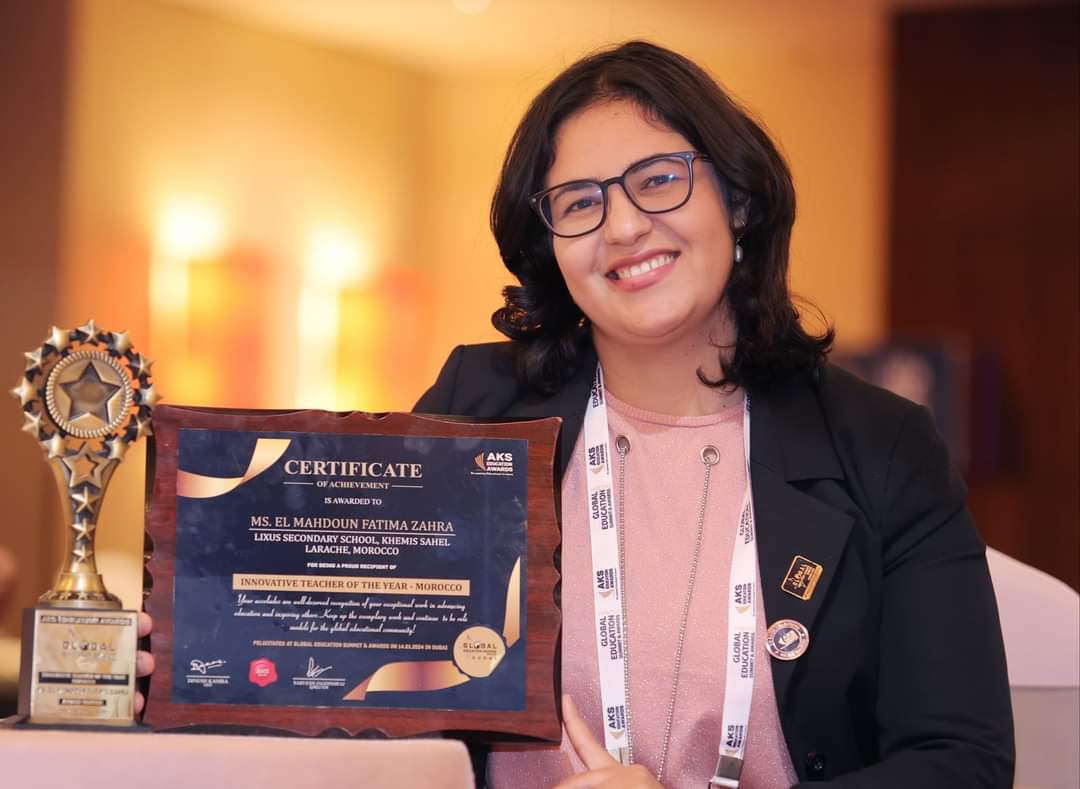تدوينة الأستاذة فاطمة الزهراء المهدون :”في هذا اليوم السعيد.. لكل امازيغ العالم ، يسعدني ان أتقاسم معكم من دبي تتويجي بجائزة الاستاذ المبدع لسنة 2024 global of innovative teacher المنظمة من طرف aks…