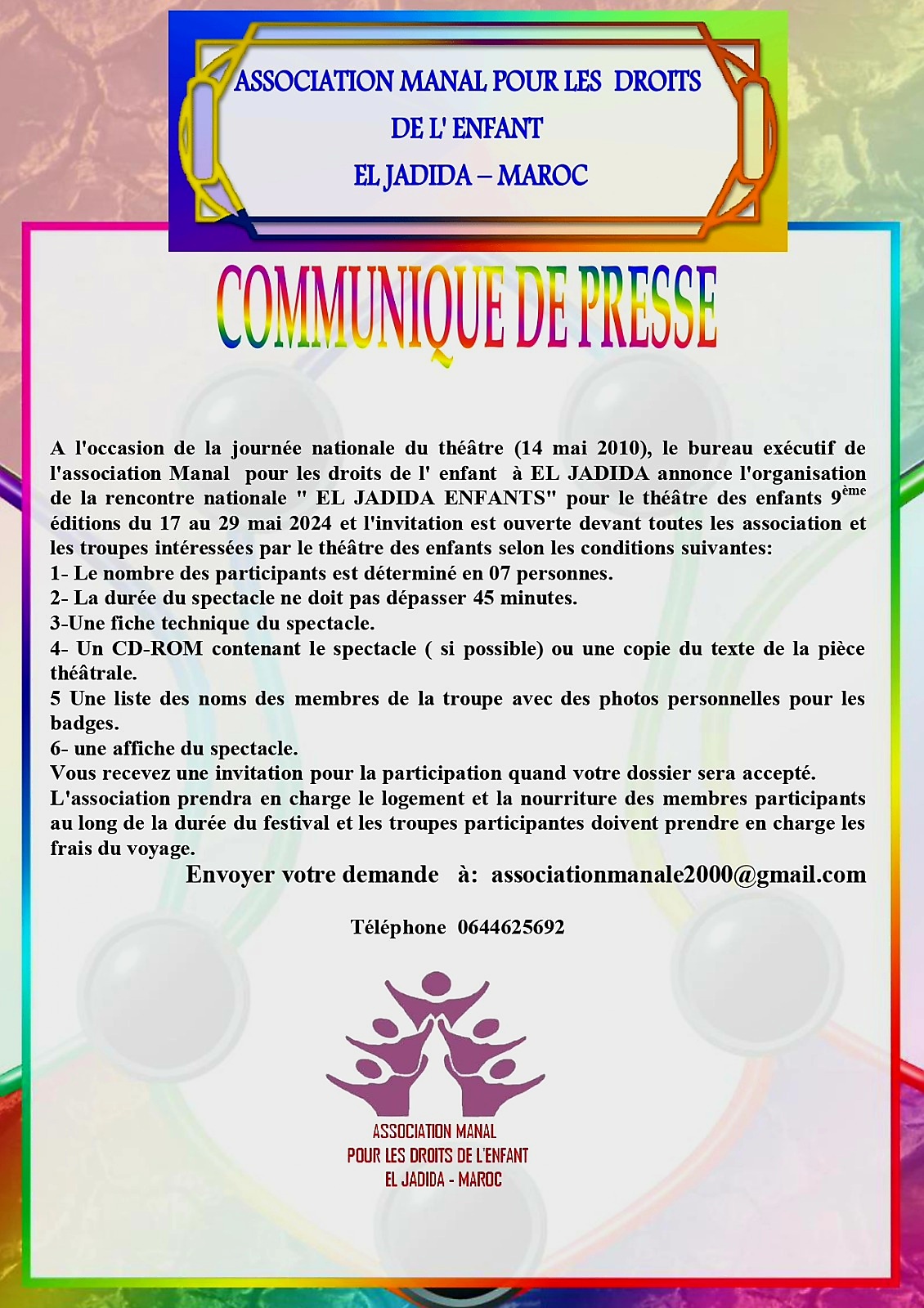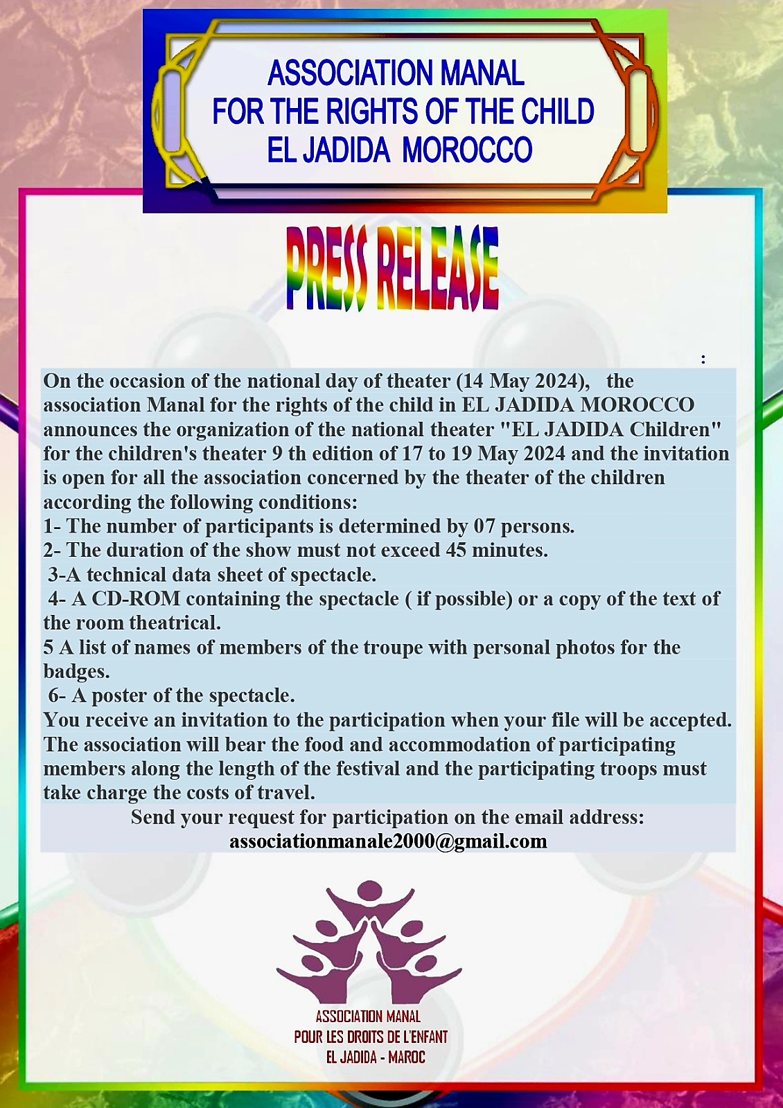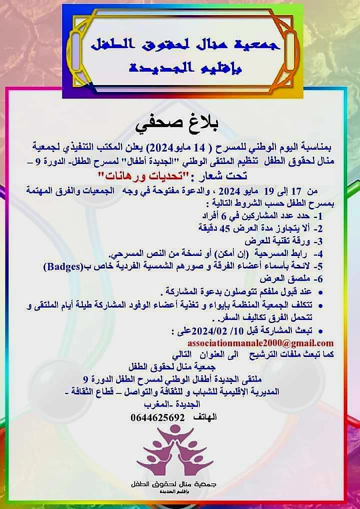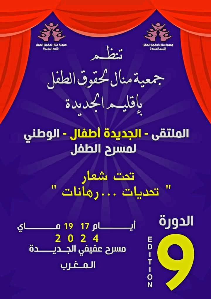تثمينا لأدواره الطلائعية، وما يقدمه للمسرح بصفة عامة ومسرح الطفل والمسرح المدرسي من جهود، عين المكتب التنفيذي لجمعية منال لحقوق الطفل بالجديدة، الأستاذ الباحث والفنان المسرحي المختار العسري، مديرا فنيا لملتقى الجديدة أطفال لمسرح الطفل،في نسخته التاسعة، والتي ستنظم من 17الى 19ماي2024 المقبل، بمسرح عفيفي بمدينة الجديدة.