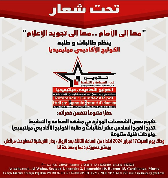 تحت شعار ” معا إلى الأمام … معا إلى تجويد الإعلام ” تعيش مدينة مراكش الحمراء يوم 17 فبراير الجاري على إيقاع حفل تخرج مميز ينظمه الكوليج الأكاديمي ميلتيميديا الذي يديره الاعلامي المتميز محمد البقالي .